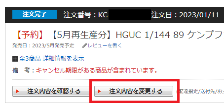 その後、注文履歴から該当の注文情報内の「注文内容を変更する」ボタンを押します。