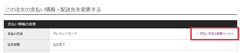 表示された注文情報を少し下にスクロールすると「この注文の支払い情報・配送先を変更する」という項目があるので「支払い方法」項目の右にある「支払い方法の変更ページへ」を選びましょう。