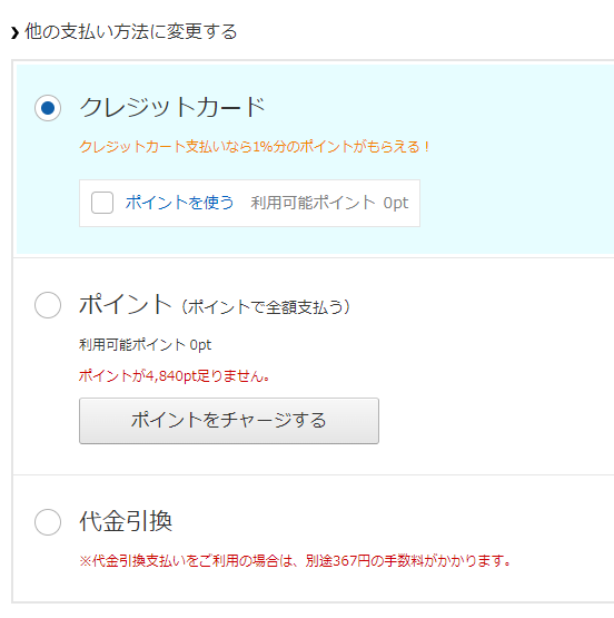 次に「クレジットカード」「ポイント」「代金引換」から支払いに使う項目を選び、使うポイントを設定したうえで、画面下にある「変更を確定する」を選べばOKです。